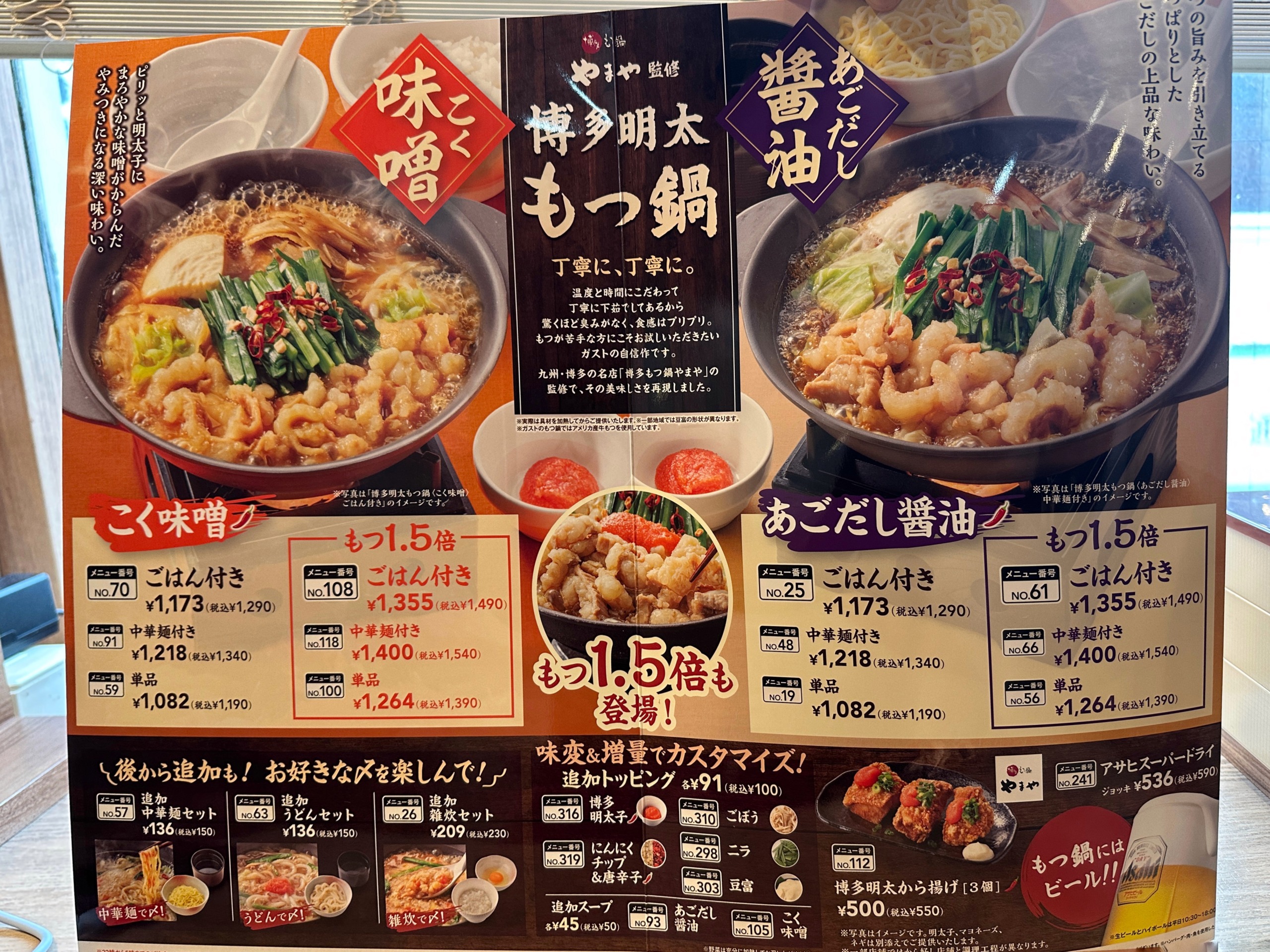 博多もつ鍋 やまや監修。スープの種類はあごだし、味噌2種類。今回はあごだしを選択。