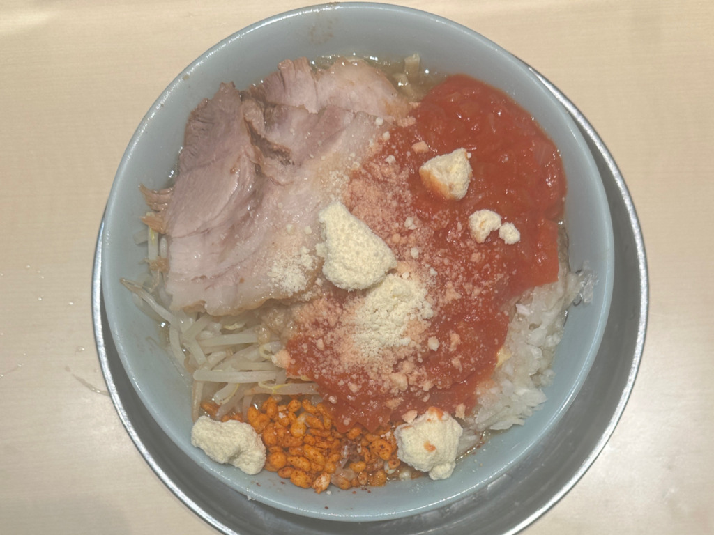 トマトペーストに粉チーズトッピングのイタリアンな限定メニュー。トマトの酸味と二郎の濃厚さがマッチした逸品。