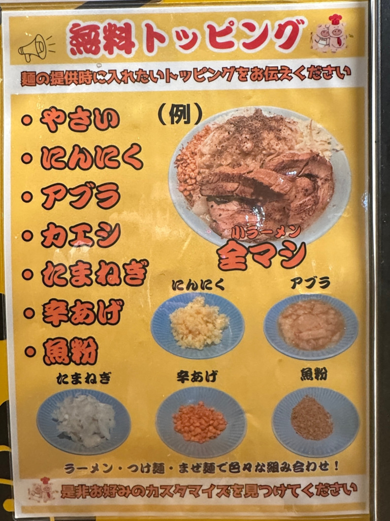 【無料トッピングコール】提供直前で、やさい・にんにく・アブラ・カエシ・たまねぎ・辛あげ・魚粉