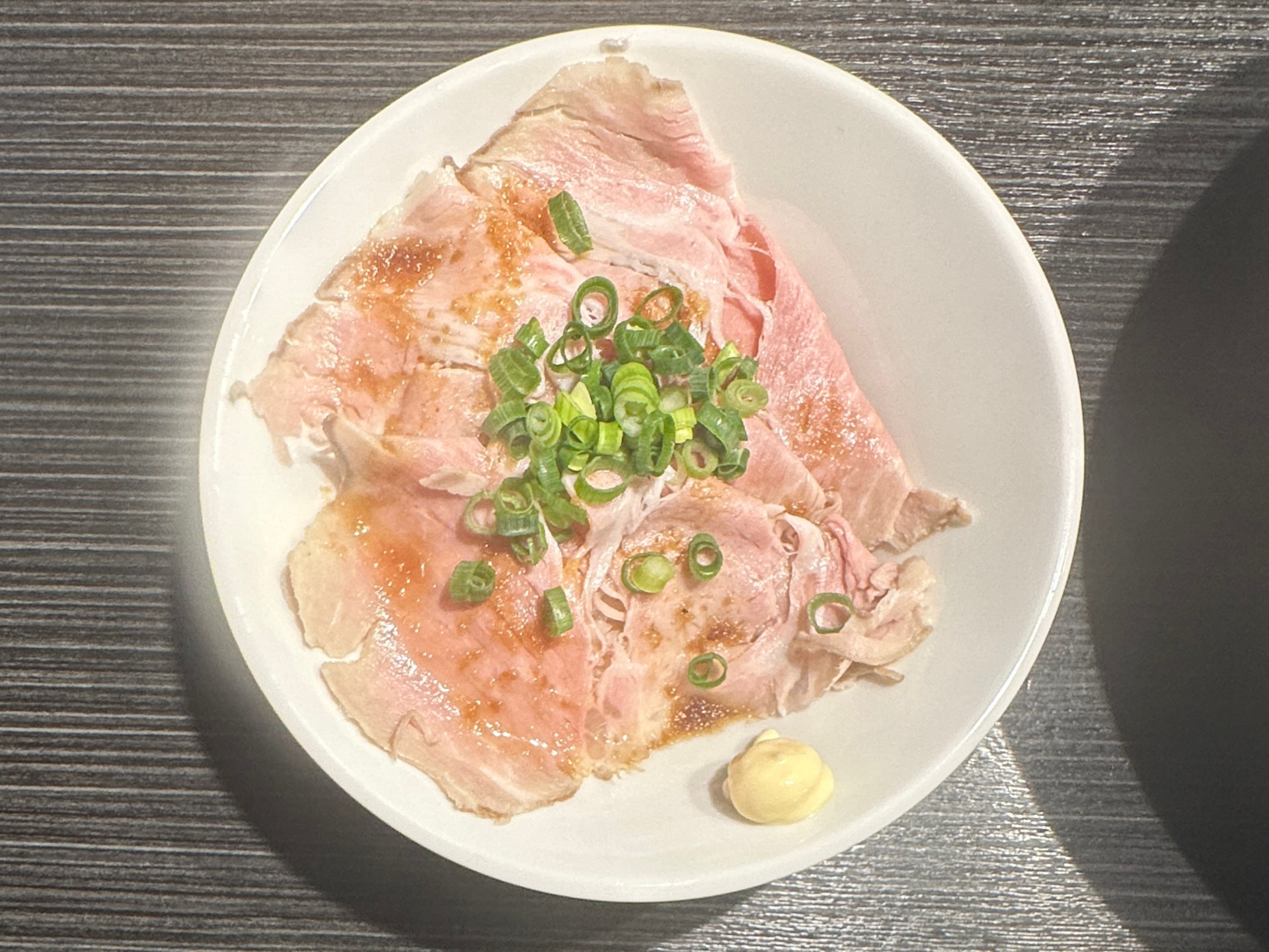 ラーメントッピングと同じかな、薄切り柔かなチャーシュー。そのままでも美味しい中、店員さんから提供の肉丼用のタレで味を濃く。