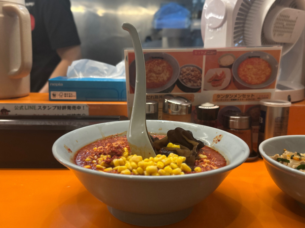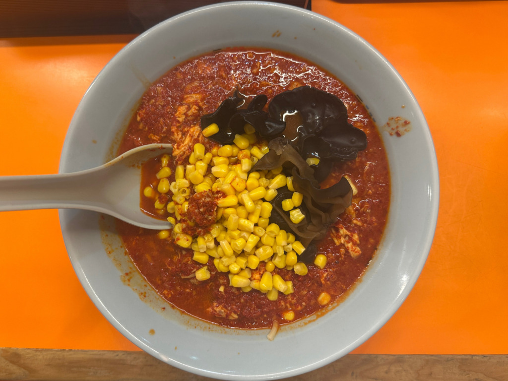 さて、運ばれてきたラーメンの具材は、たっぷりの唐辛子が彩るスープに、ふんわりとした溶き卵、ガツンと香るニンニク、コリコリとした食感が楽しいきくらげ、彩り豊かな甘さのコーン、そして旨味の核となる挽肉。