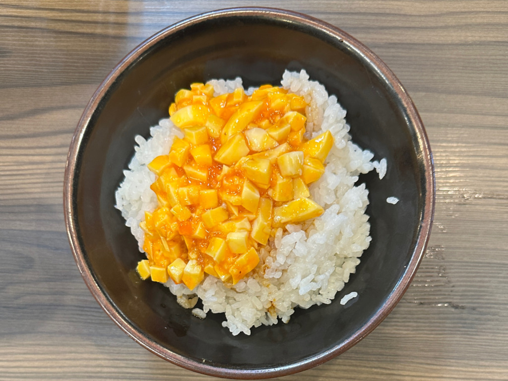 ゆで卵をくずして濃いめのタレが掛かったサイドメニュー。シンプルながら絶品なのとコスパが良い価格設定で満足度は高かったです。