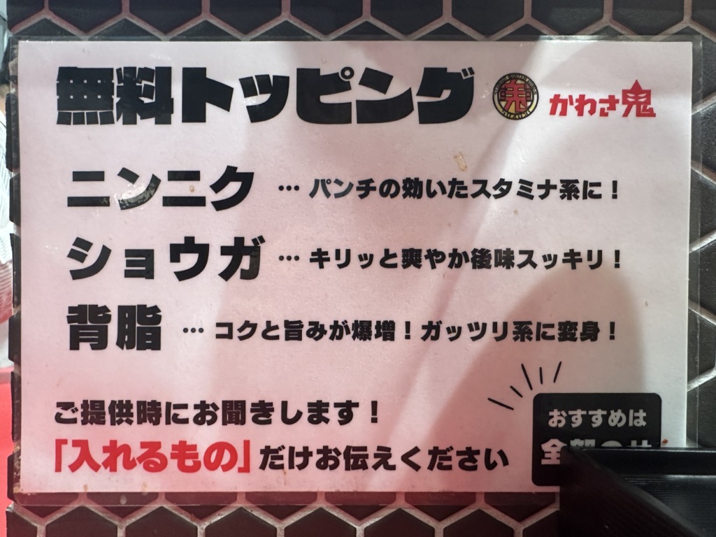 【無料トッピングコール】提供直前で(ニンニク・ショウガ・背脂)がトッピング可能。