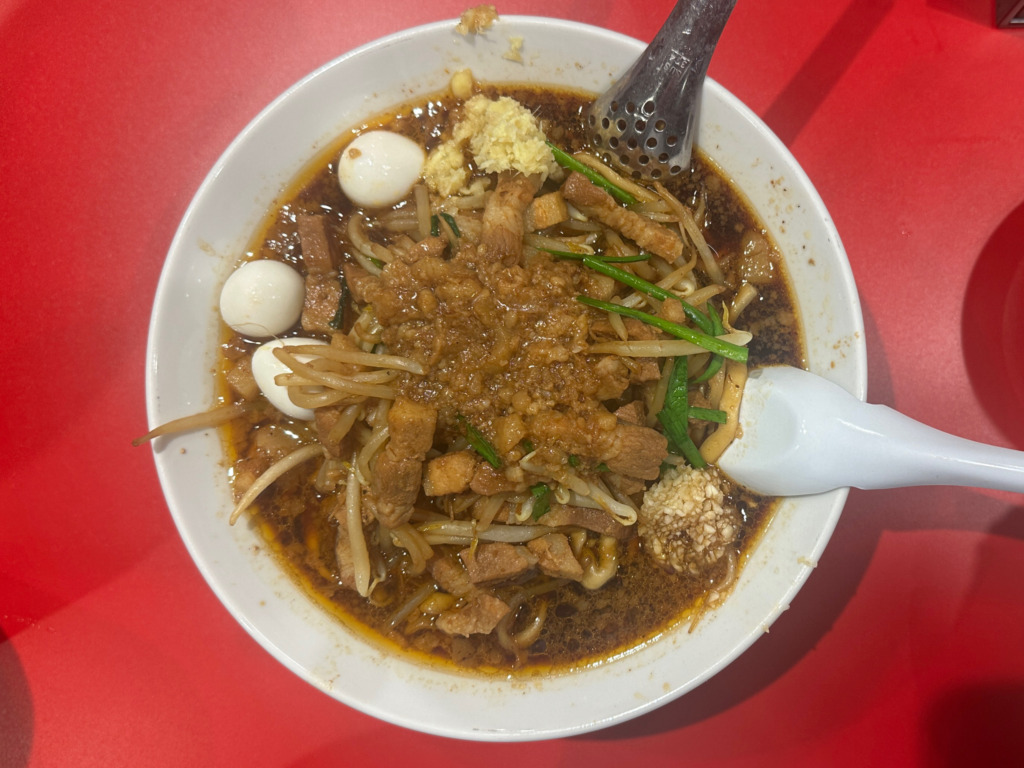 「ニンニク・ショウガ・背脂の全部のせ」をお願いし、ジャンクかつ芳醇な香りを最高潮に高める完璧なオーダーが完成しました!