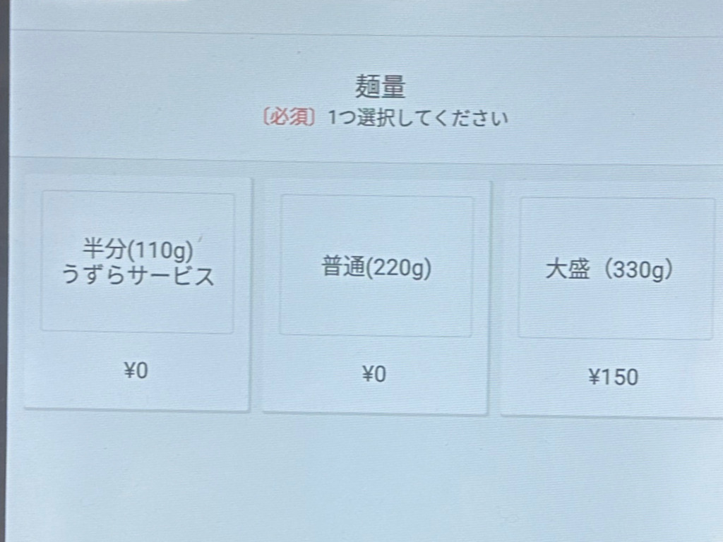 • 麺量:迷わず食べ応えのある普通(220g)をポチッ!