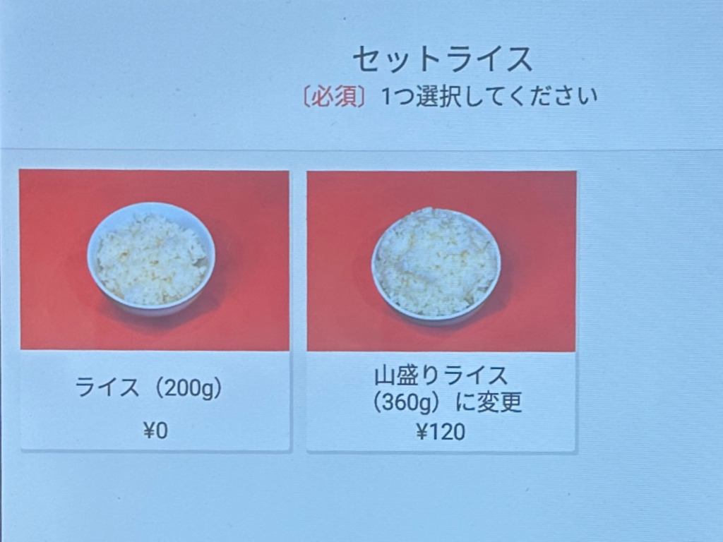 • セットライス:魅惑の変更メニュー、山盛りライス(360g)へアップグレードをポチッ!🍚