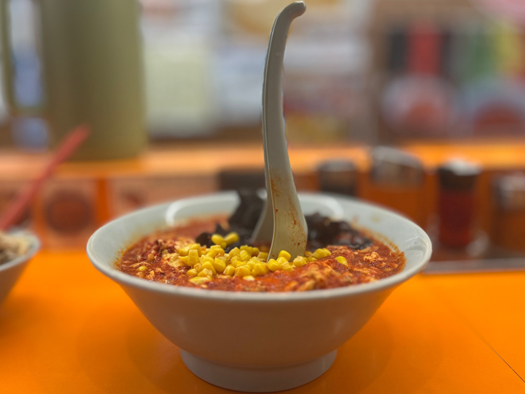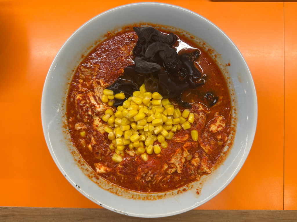 さて、運ばれてきたラーメンの具材は、たっぷりの唐辛子が彩るスープに、ふんわりとした溶き卵、ガツンと香るニンニク、コリコリとした食感が楽しいきくらげ、彩り豊かな甘さのコーン、そして旨味の核となる挽肉。