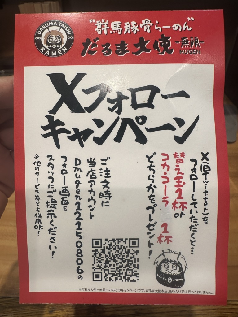 Xフォローキャンペーン中。Xフォロー画面提示で替え玉1杯orコカコーラ無料でコカコーラをお願いし。