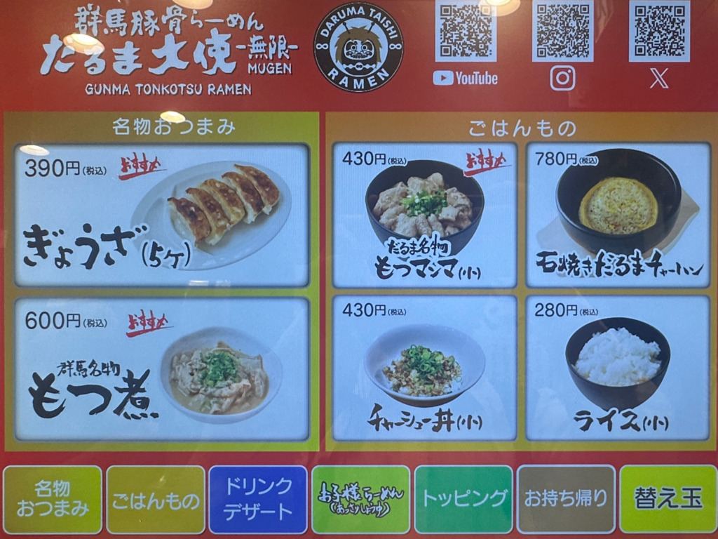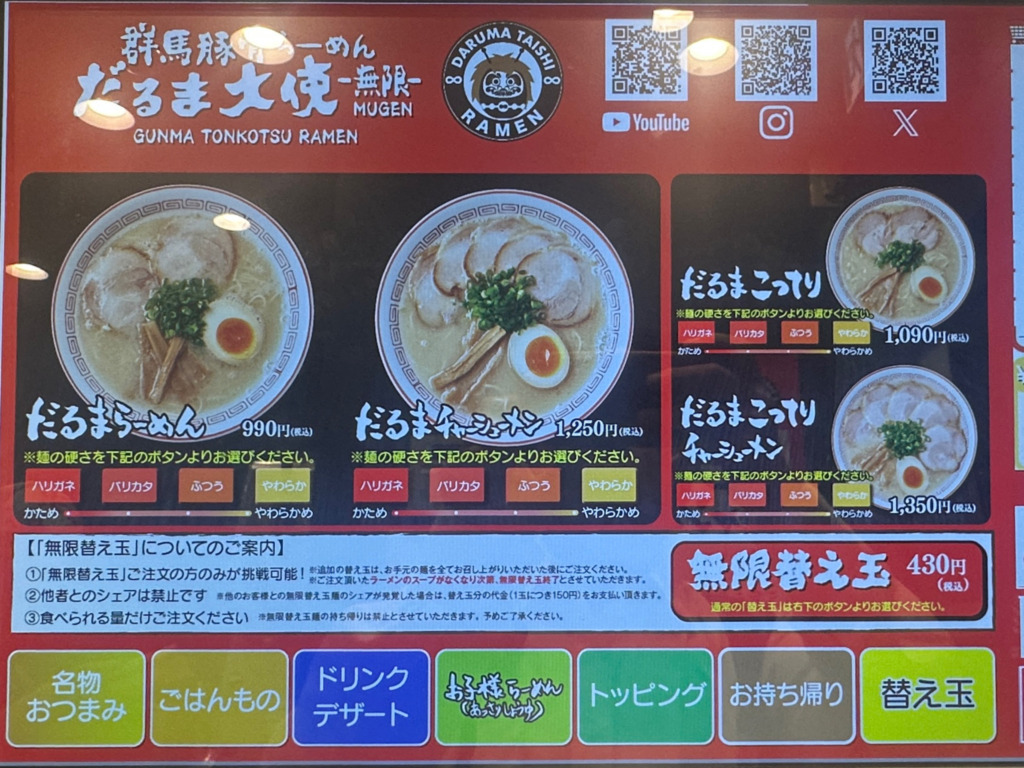 【店舗名】群馬豚骨らーめん だるま大使 無限 武蔵新城店