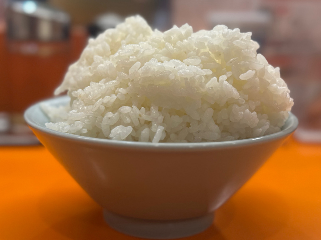漫画盛りほどでは無いものの、それなりに盛られている特ライス。持った瞬間、ずっしり重く。なかなかのボリューム。