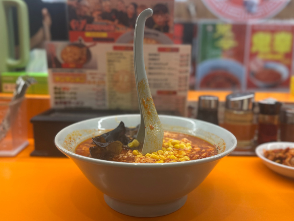 さて、運ばれてきたラーメンの具材は、たっぷりの唐辛子が彩るスープに、ふんわりとした溶き卵、ガツンと香るニンニク、コリコリとした食感が楽しいきくらげ、彩り豊かな甘さのコーン、そして旨味の核となる挽肉。