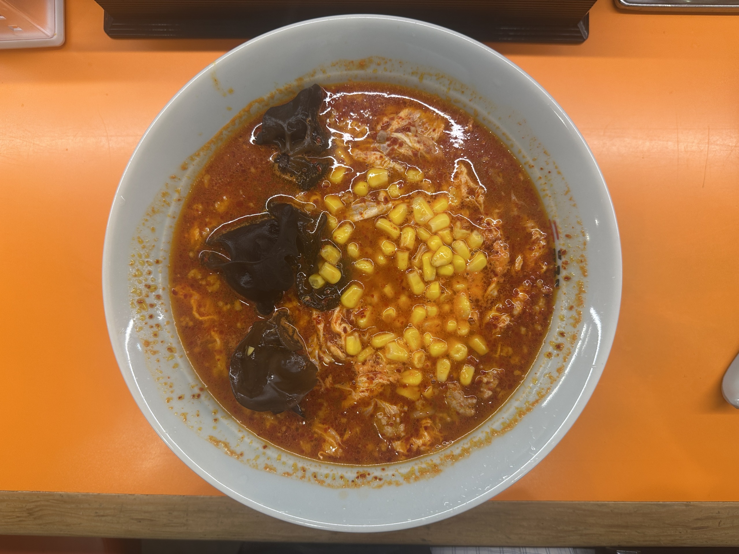 さて、運ばれてきたラーメンの具材は、たっぷりの唐辛子が彩るスープに、ふんわりとした溶き卵、ガツンと香るニンニク、コリコリとした食感が楽しいきくらげ、彩り豊かな甘さのコーン、そして旨味の核となる挽肉。