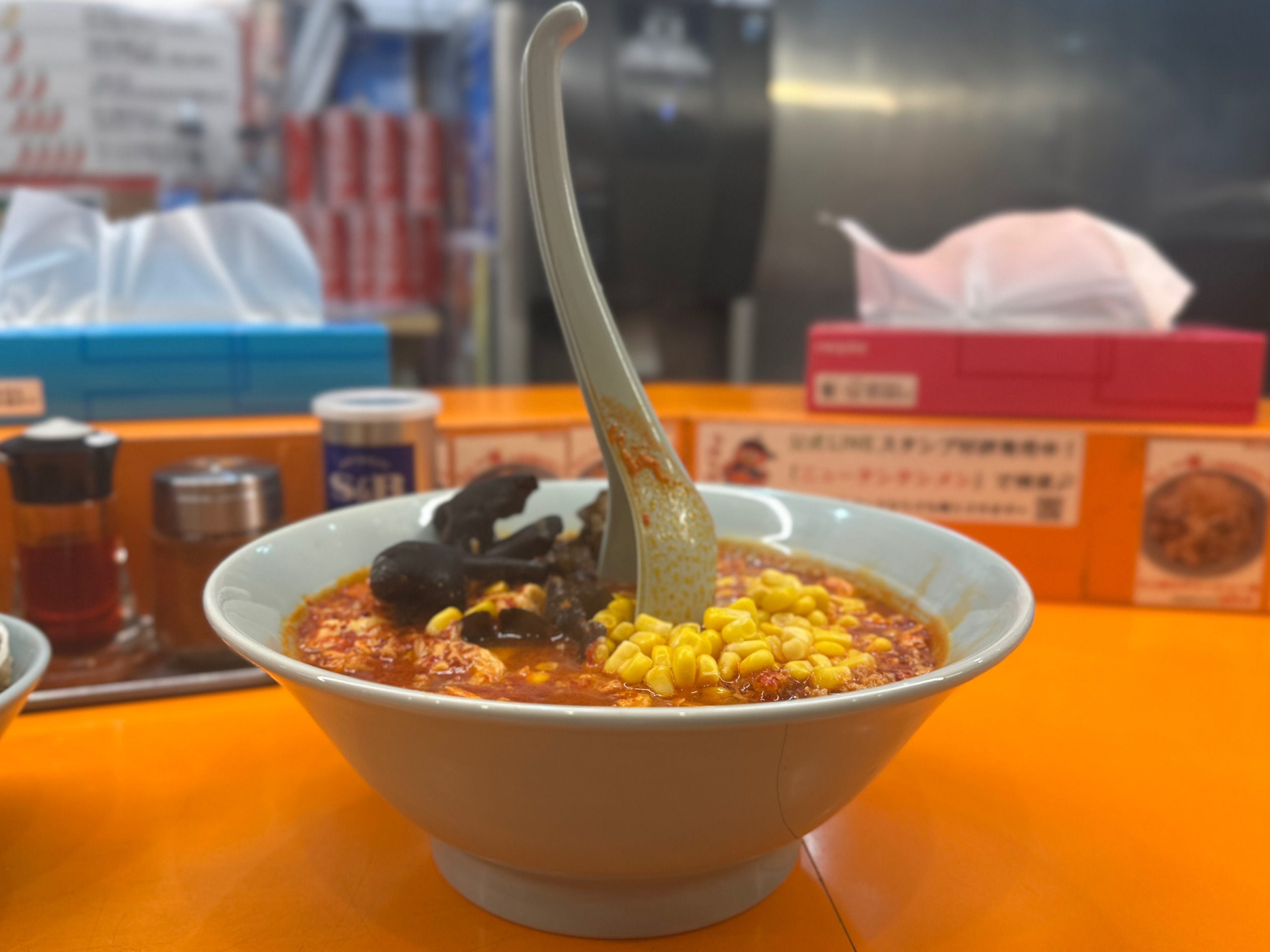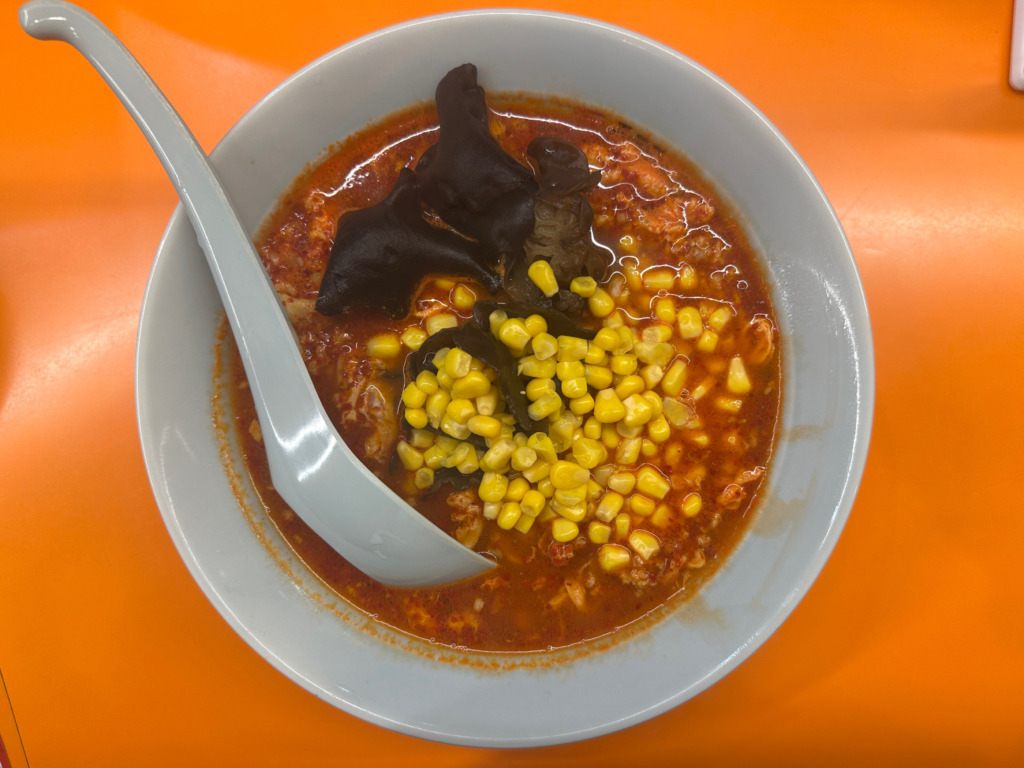 さて、運ばれてきたラーメンの具材は、たっぷりの唐辛子が彩るスープに、ふんわりとした溶き卵、ガツンと香るニンニク、コリコリとした食感が楽しいきくらげ、彩り豊かな甘さのコーン、そして旨味の核となる挽肉。