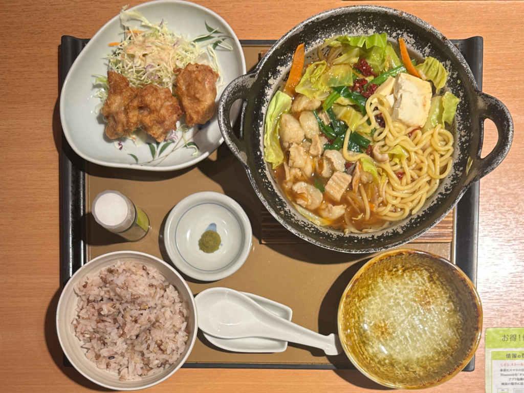 気になっていたもつ鍋定食を求めて。唐揚げ付きを。さらには白米からもち麦ごはんに変更。その場合、ご飯のお替わりは「もち麦ごはん」ではなく「白米」であれば無料。
