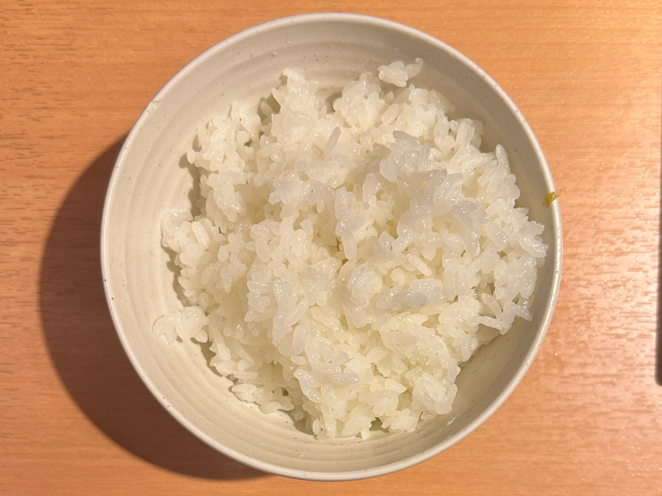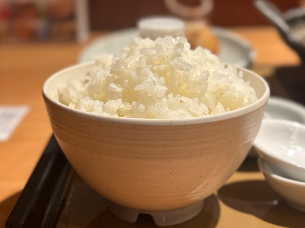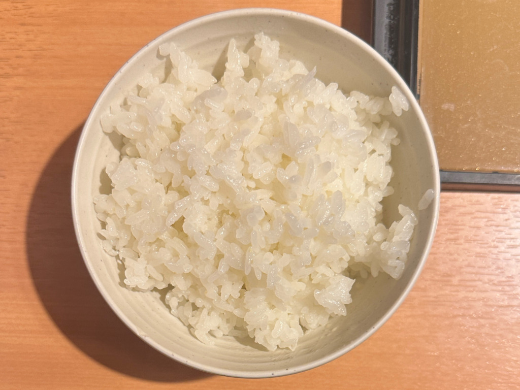 2杯目白米 中盛+小盛を。セルフでお替わり。サイズは一口、小盛、並盛、中盛が指定出来て、お茶碗をセットしてサイズボタンを押すと自動で盛られる機会。