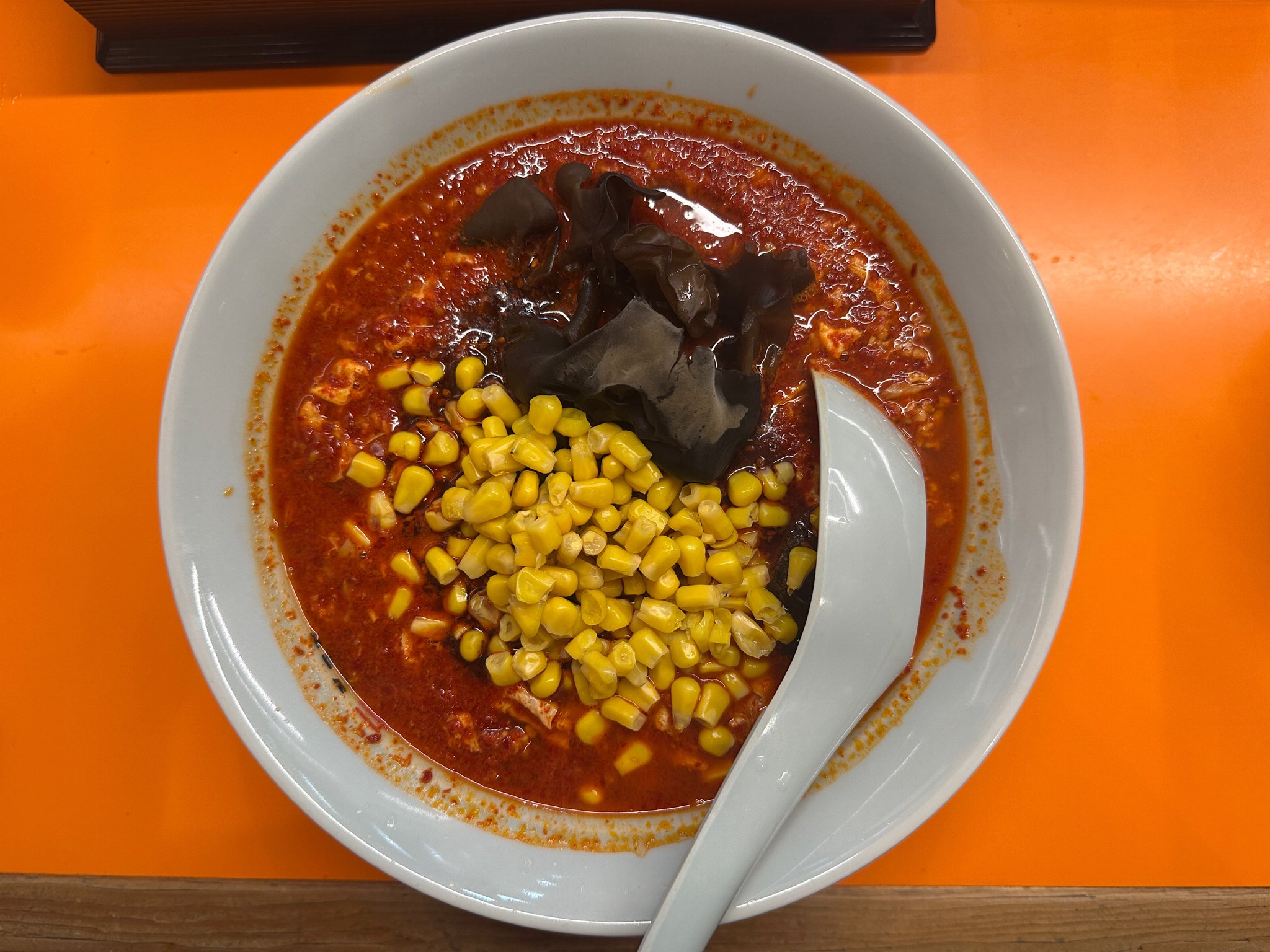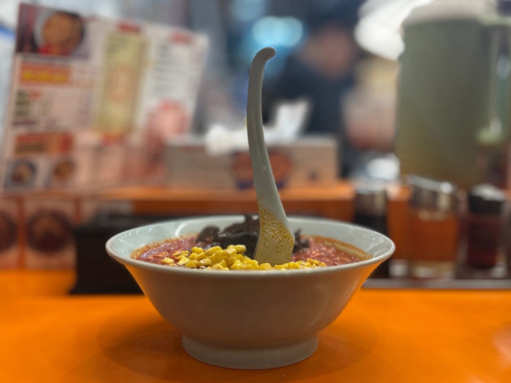 さて、運ばれてきたラーメンの具材は、たっぷりの唐辛子が彩るスープに、ふんわりとした溶き卵、ガツンと香るニンニク、コリコリとした食感が楽しいきくらげ、彩り豊かな甘さのコーン、そして旨味の核となる挽肉。