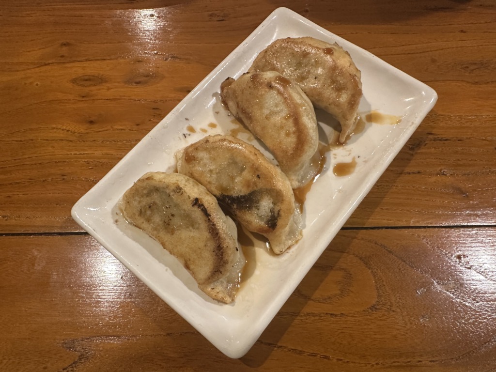 やや大きめサイズの焼き餃子が5個。焼き加減が秀逸。外側のパリパリ食感が旨旨。ニンニクは感じず。生姜が前面に出てるかな。