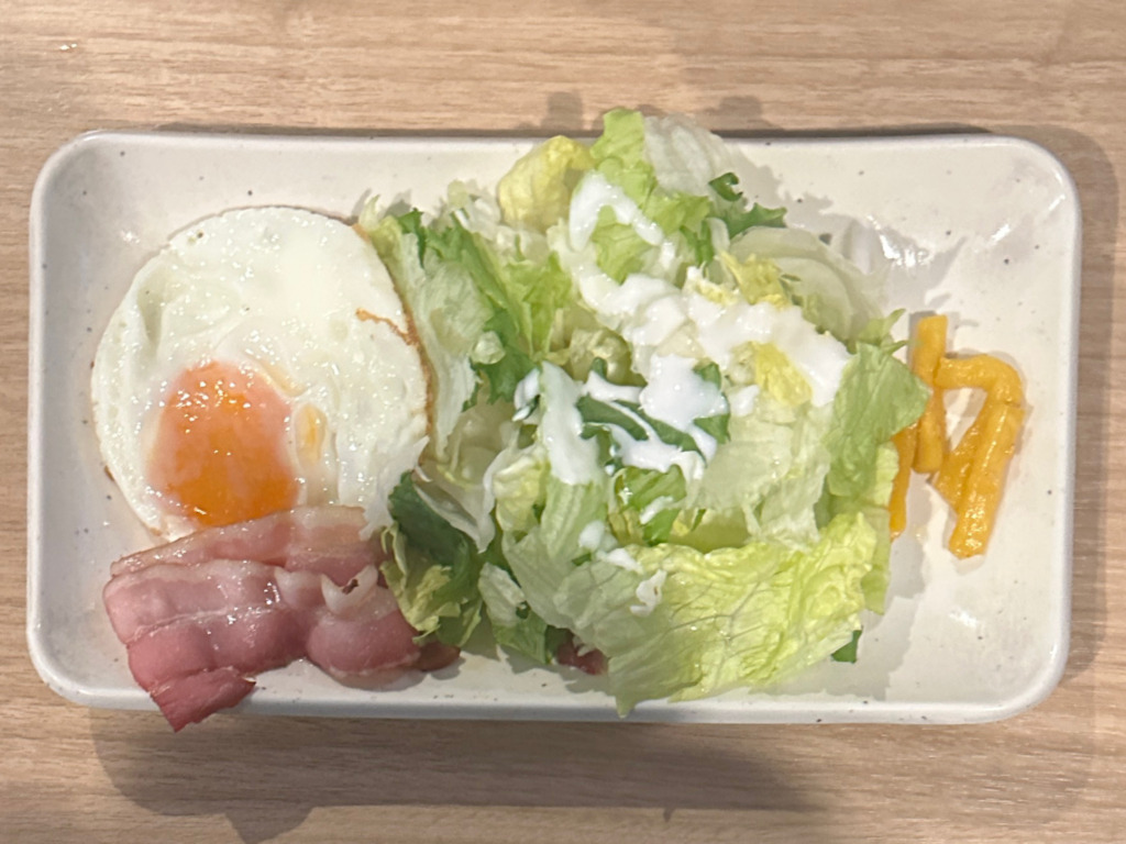 ベーコンエッグは、セルフでご飯に乗せてベーコンエッグ丼にしたり。