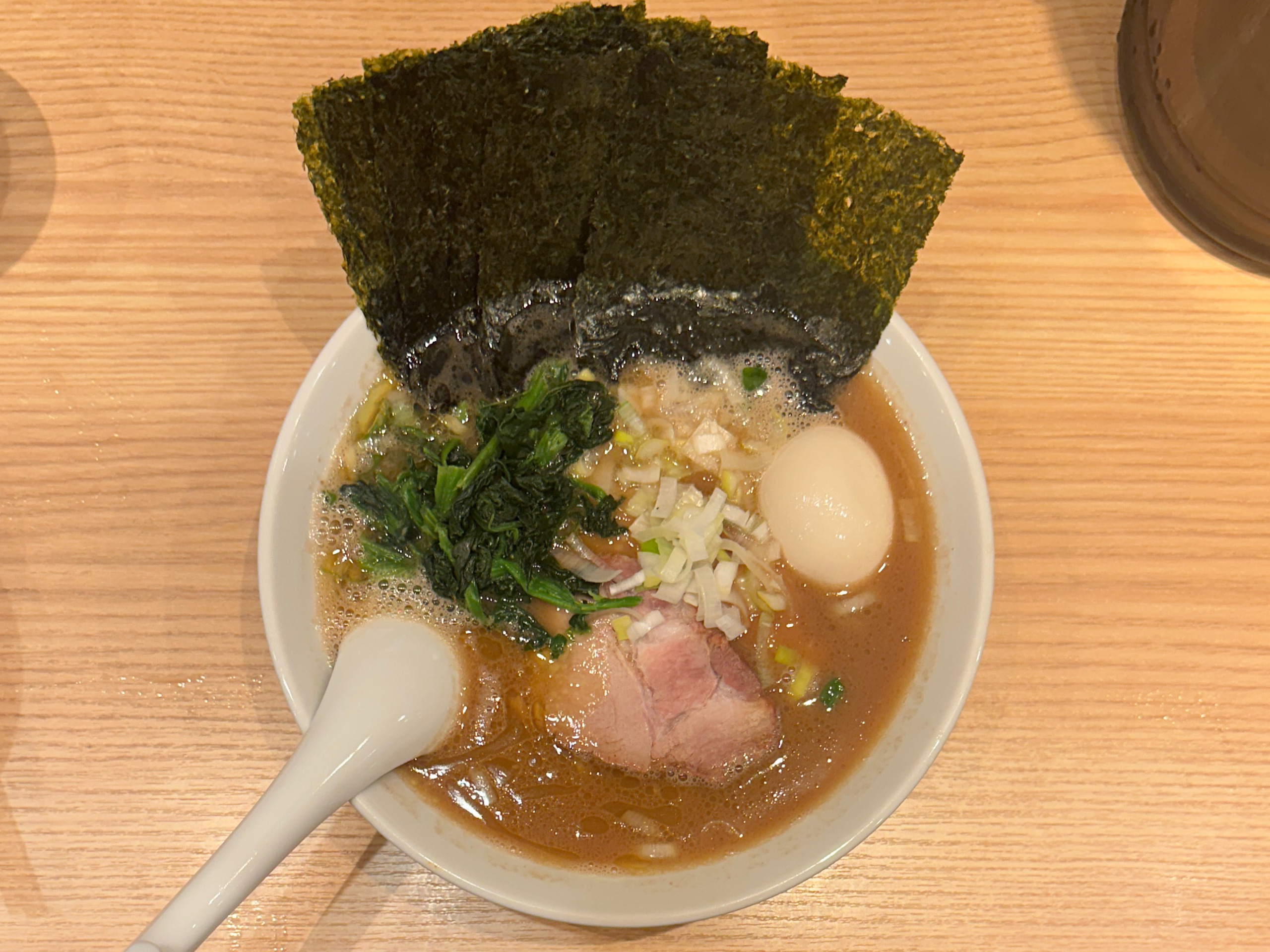 食券回収時に硬め濃いめ多めを申告。カエシが比較的前面に出た濃厚家系ラーメン。全体的にバランスタイプな印象