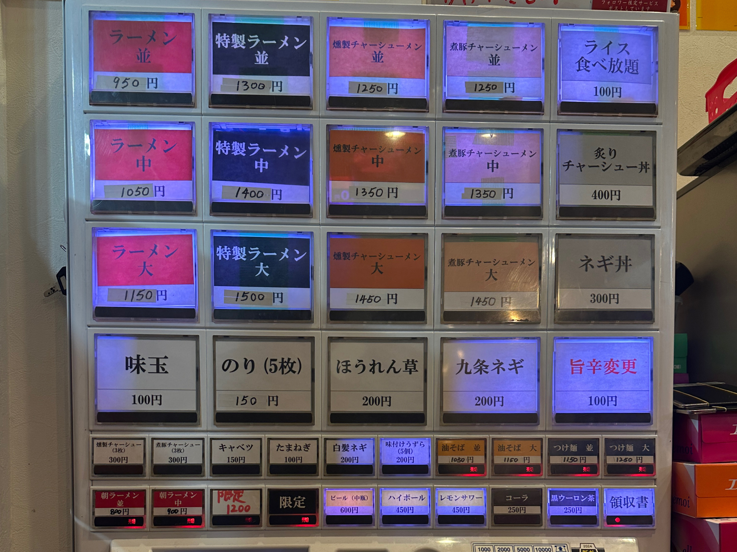 【お好みコール】食券回収時に麺の硬さ(硬め・普通・柔め)、味の濃さ(濃いめ・普通・うすめ)、油の量(多め・普通・少なめ)が調整可能。