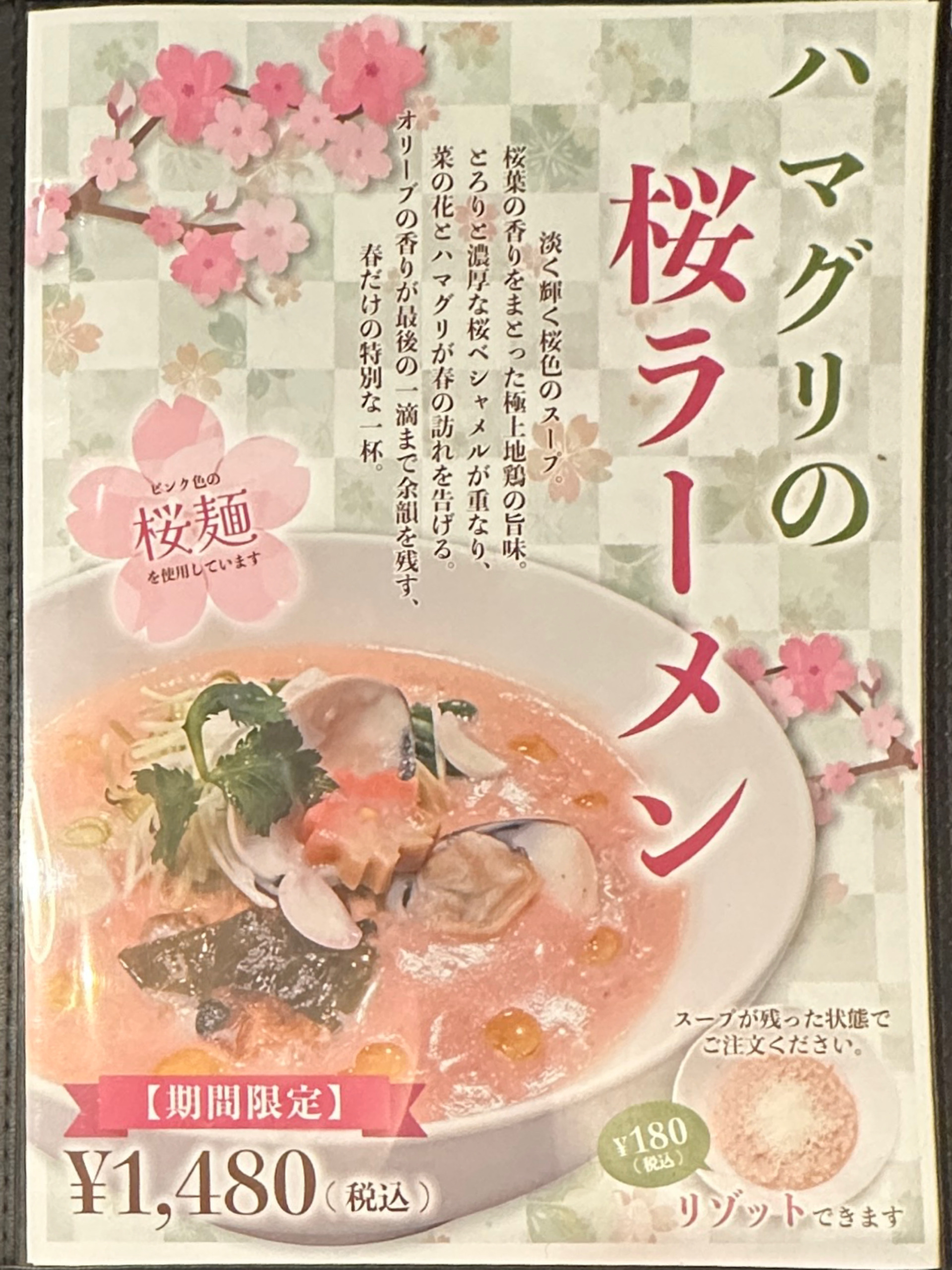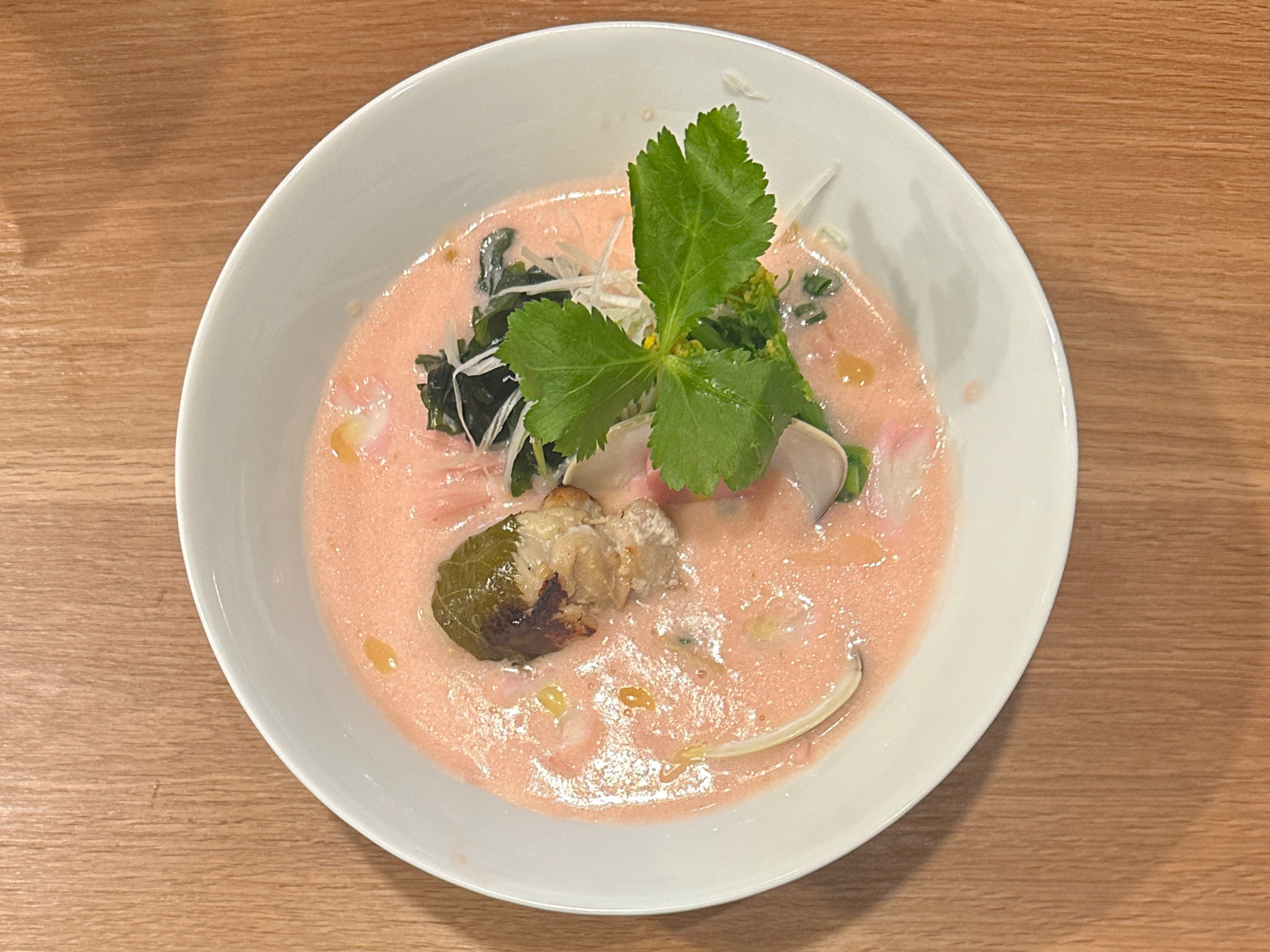 桜のイメージにピッタリなスープも麺もピンク色💕見た目の鮮やかさ。太平打ち麺はスープとの絡みが良く。トッピングでも桜麩や花びら百合根で、桜っぽさを演出。スープは、ベシャメルソースがベースか。塩分濃度は濃過ぎず薄過ぎずちょうど良い塩梅。鶏ガラとか豚骨は分からなかった😂 いわゆるホワイトソースのピンク版。ドロっとした粘度あるスープ。