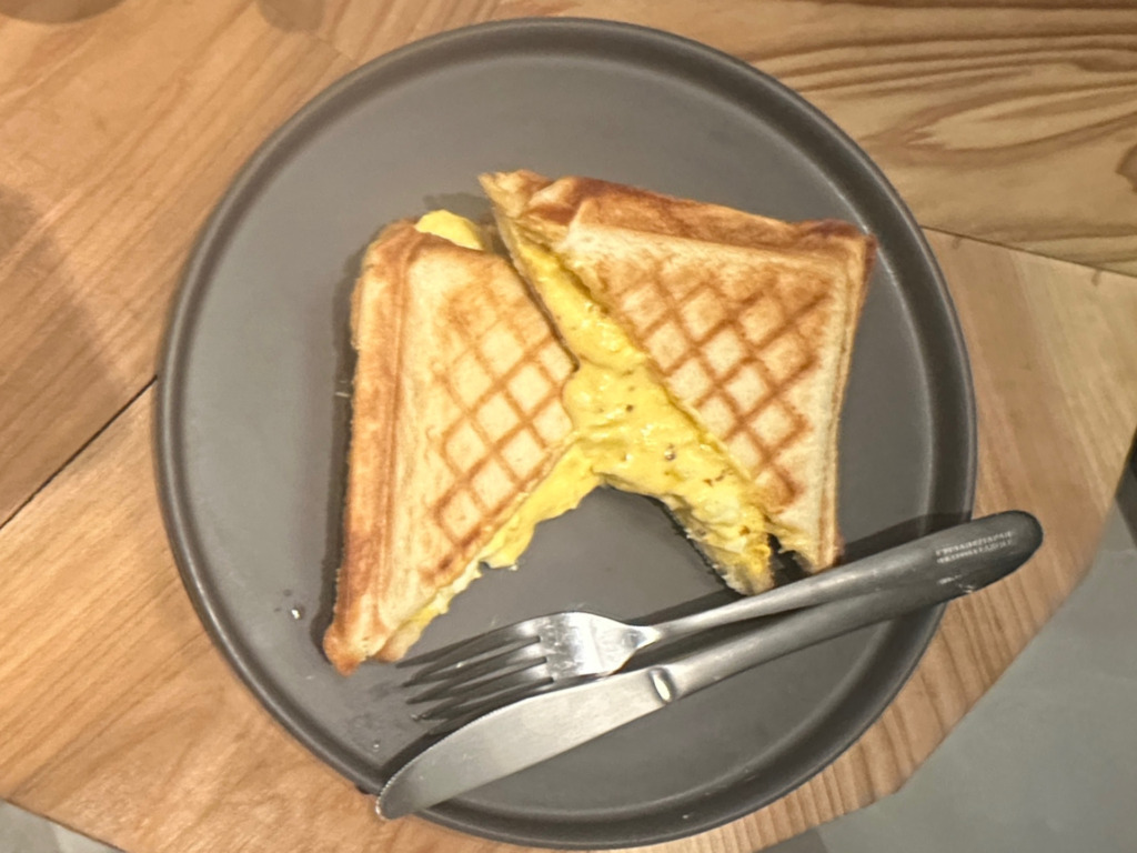 焼きたて熱々のホットサンド。卵たっぷり。チーズも若干入っていたような。