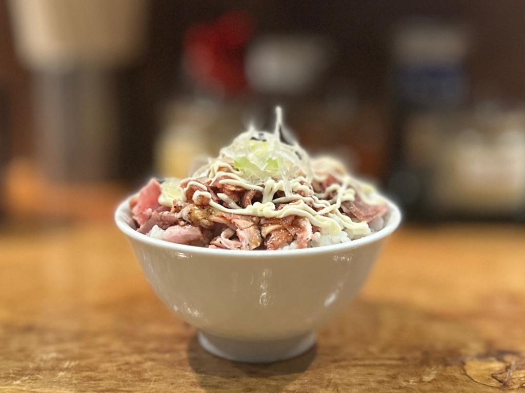 レアチャーシュー他な豚丼にネギやマヨネーズ。