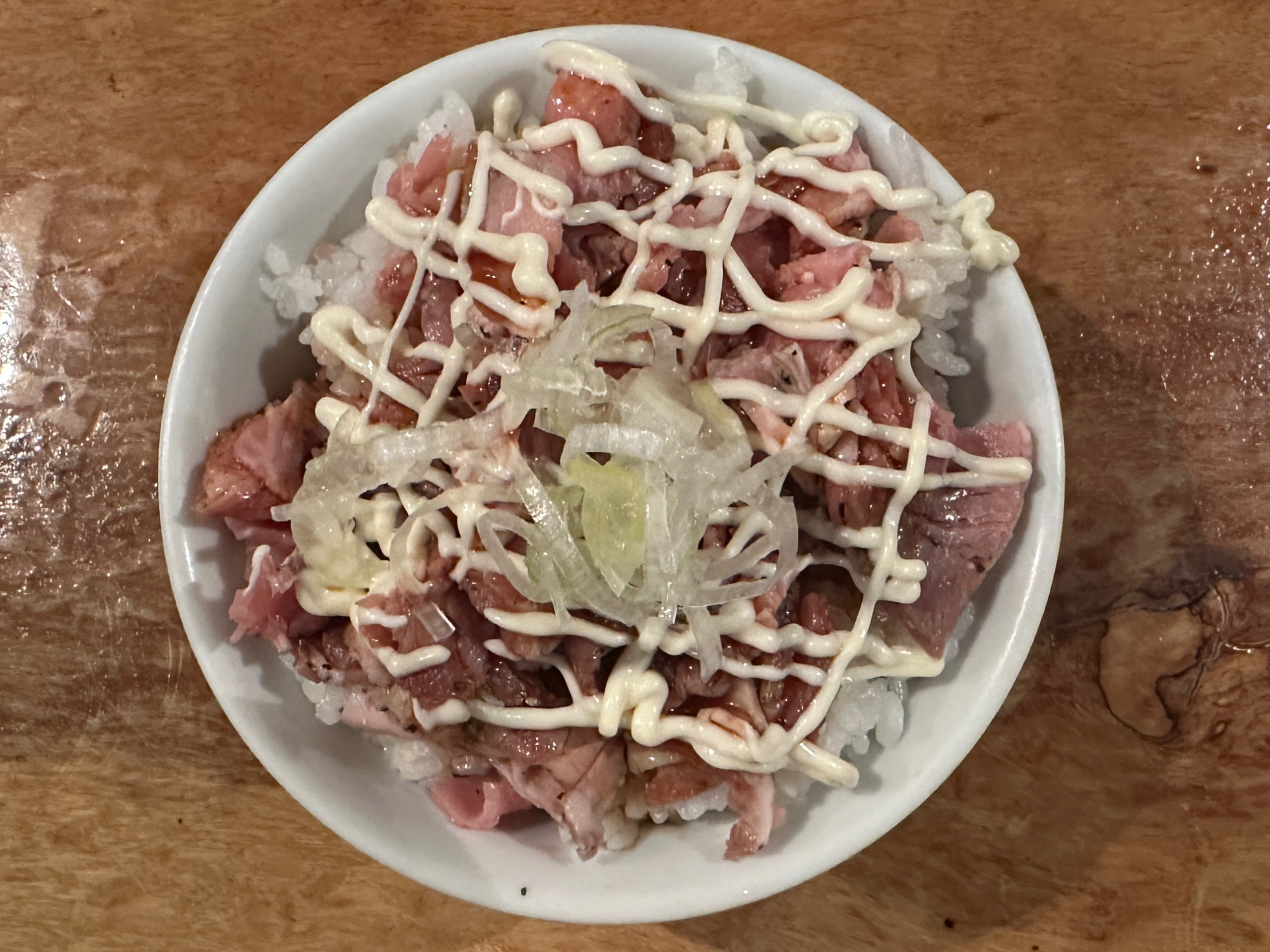 レアチャーシュー他な豚丼にネギやマヨネーズ。