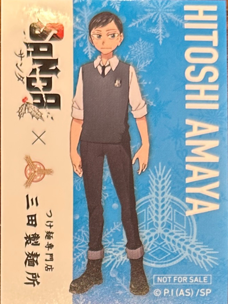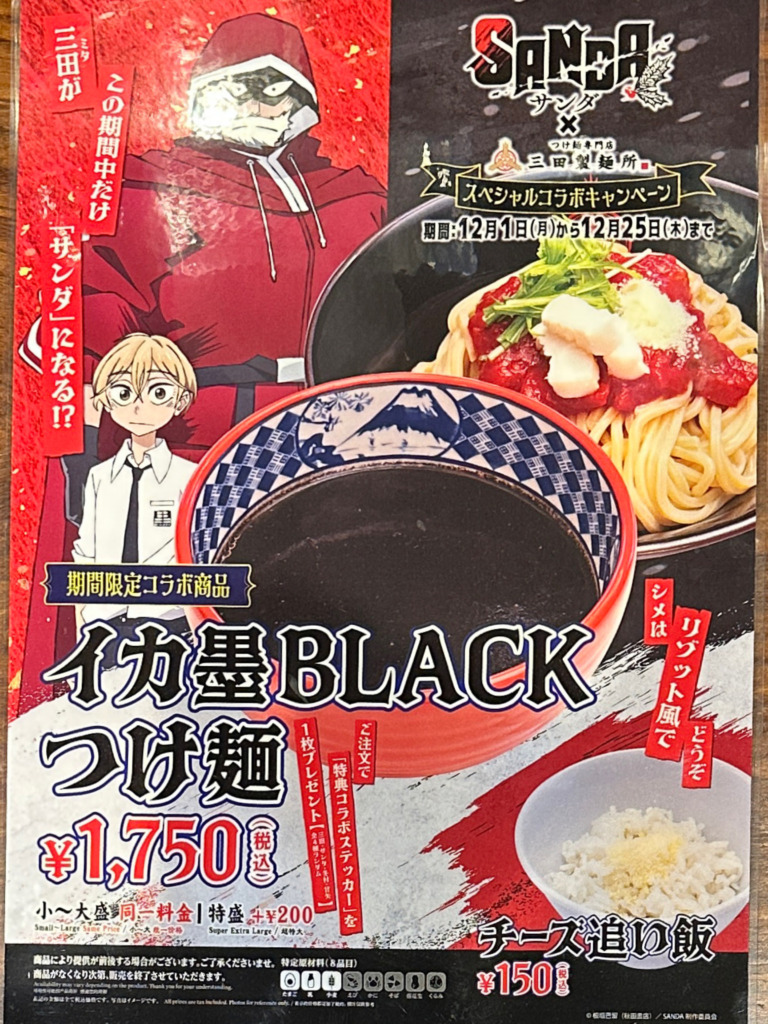 SANDA✖️つけ麺専門店 三田製麺所コラボメニュー。注文すると特典ステッカー1枚ランダムで貰えて。