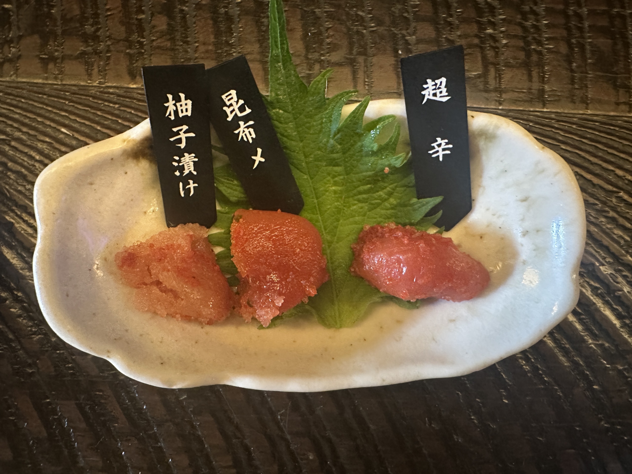 明太子3種。柚子漬け、昆布〆、超辛のこだわりの一品。辛い、そこまで辛く無いの違いしか分からない🤦🏻‍♂️