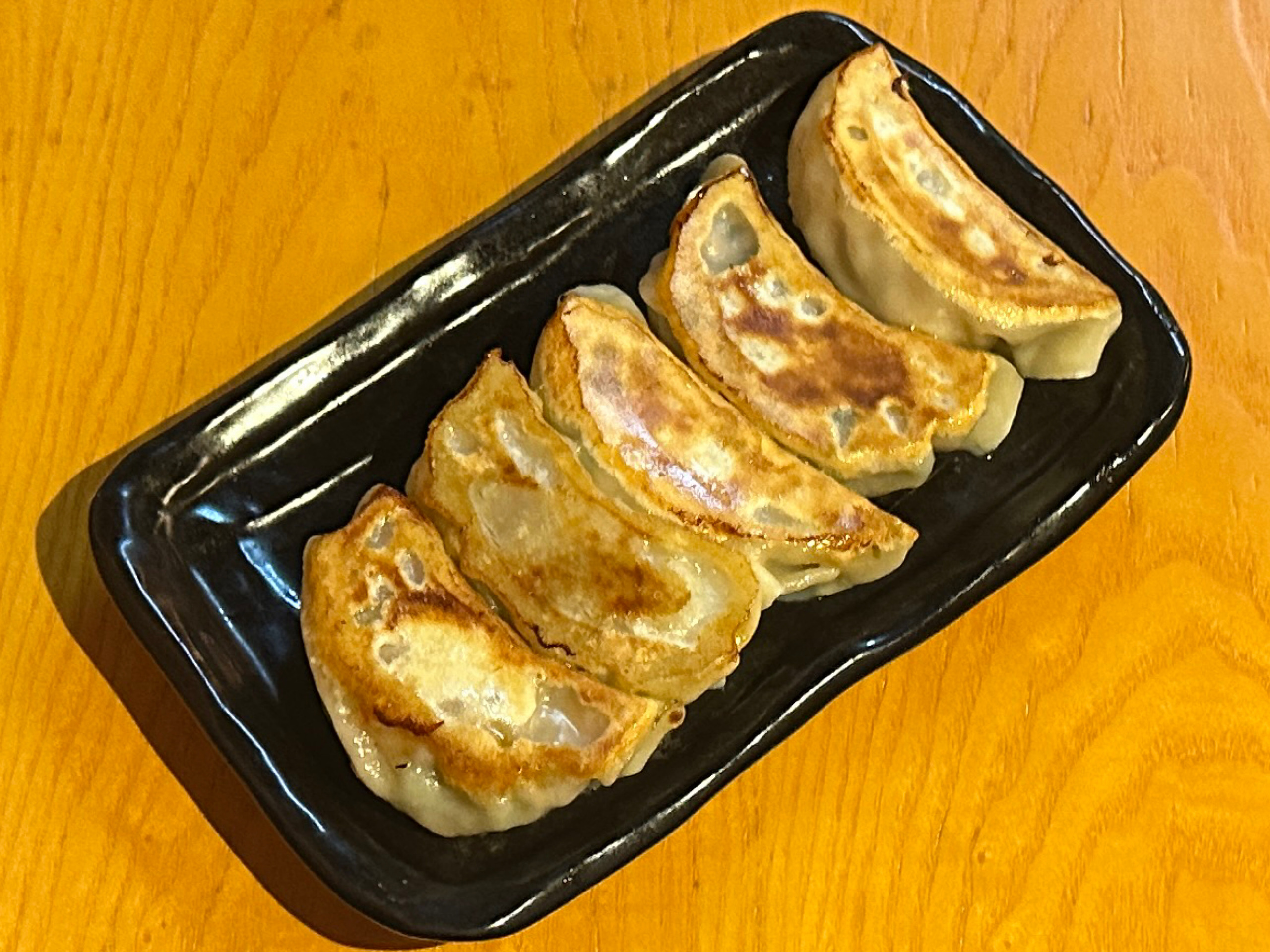 やや大判な焼き餃子。皮薄め、肉汁多め。