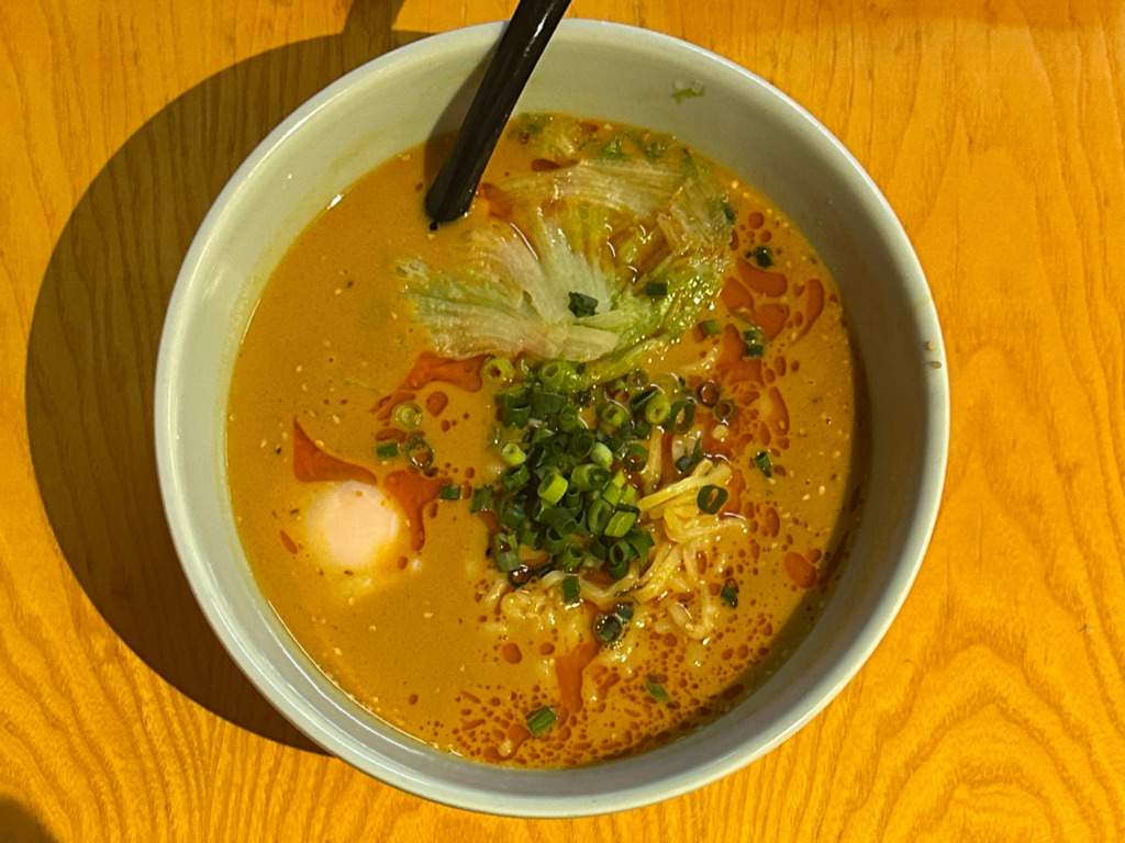 着丼と同時に芝麻醤の胡麻の風味がぽわわわわ〜んと漂い。辛さはピリ辛未満。ナッツの歯応えがアクセント。クリーミーマイルドタイプのスープ。