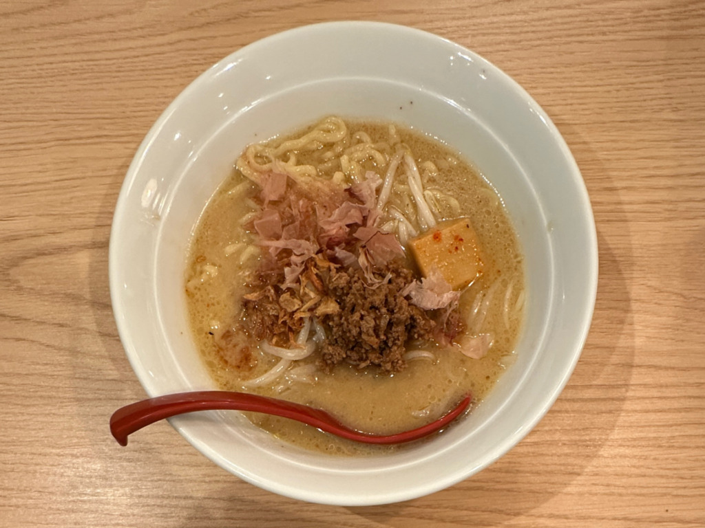 4/3(金)㊗️オープン🎊 味噌ラーメン専門店。さりげない甘み・旨みを感じる一杯。鰹節トッピングが特徴的。LINE登録で100円引きクーポンあり。