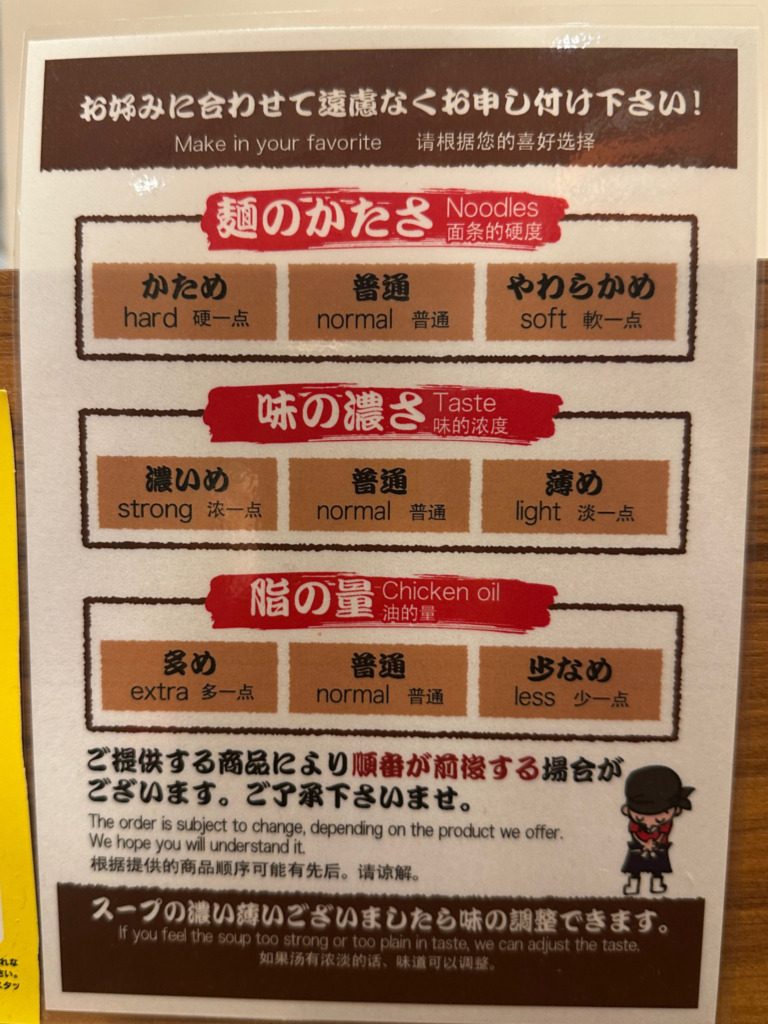 【お好みコール】食券回収時に麺のかたさ、味の濃さ、脂の量が調整可能。※限定の醤油壱郎は、麺のかたさのみ。