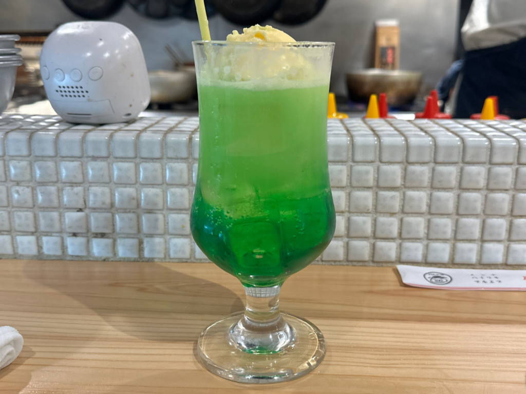 純喫茶メニューにありそうな昭和感満載のクリームソーダ。写真撮る前に少し飲んでしまった🥹