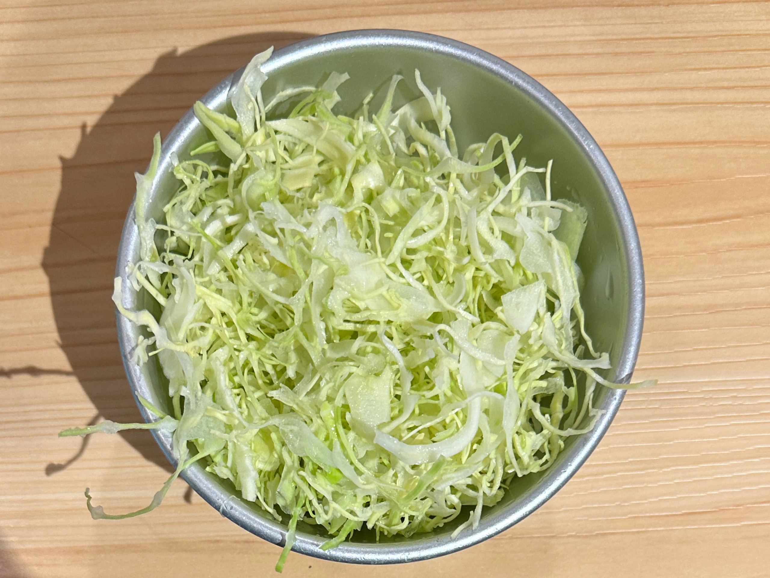 千切りキャベツにタルタルソース。後半タルタルが足りなくなったら卓上のソースを掛けても良いかも。