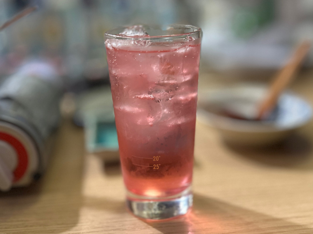 コダマ飲料が製造する「梅しそ」風味のピンク色の炭酸飲料(割り材)のサワー。