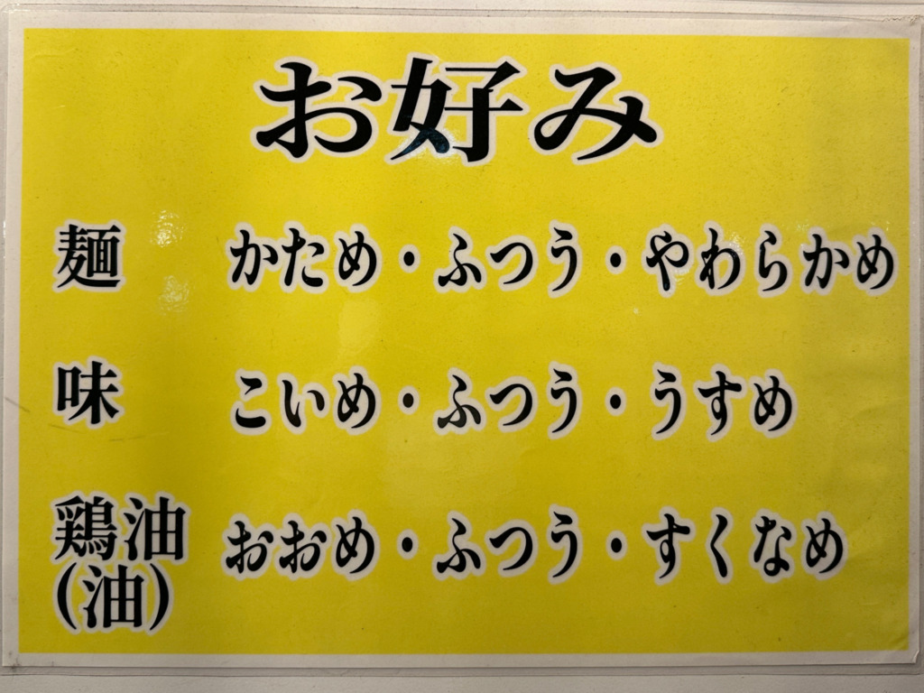 【お好みコール】食券回収時に麺(かため・ふつう・やわらかめ)、味(こいめ・ふつう・うすめ)、鶏油(油)(おおめ・ふつう・すくなめ)が調整可能