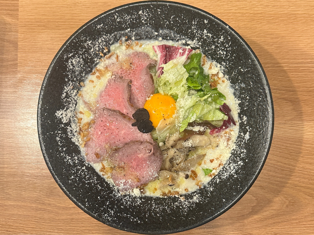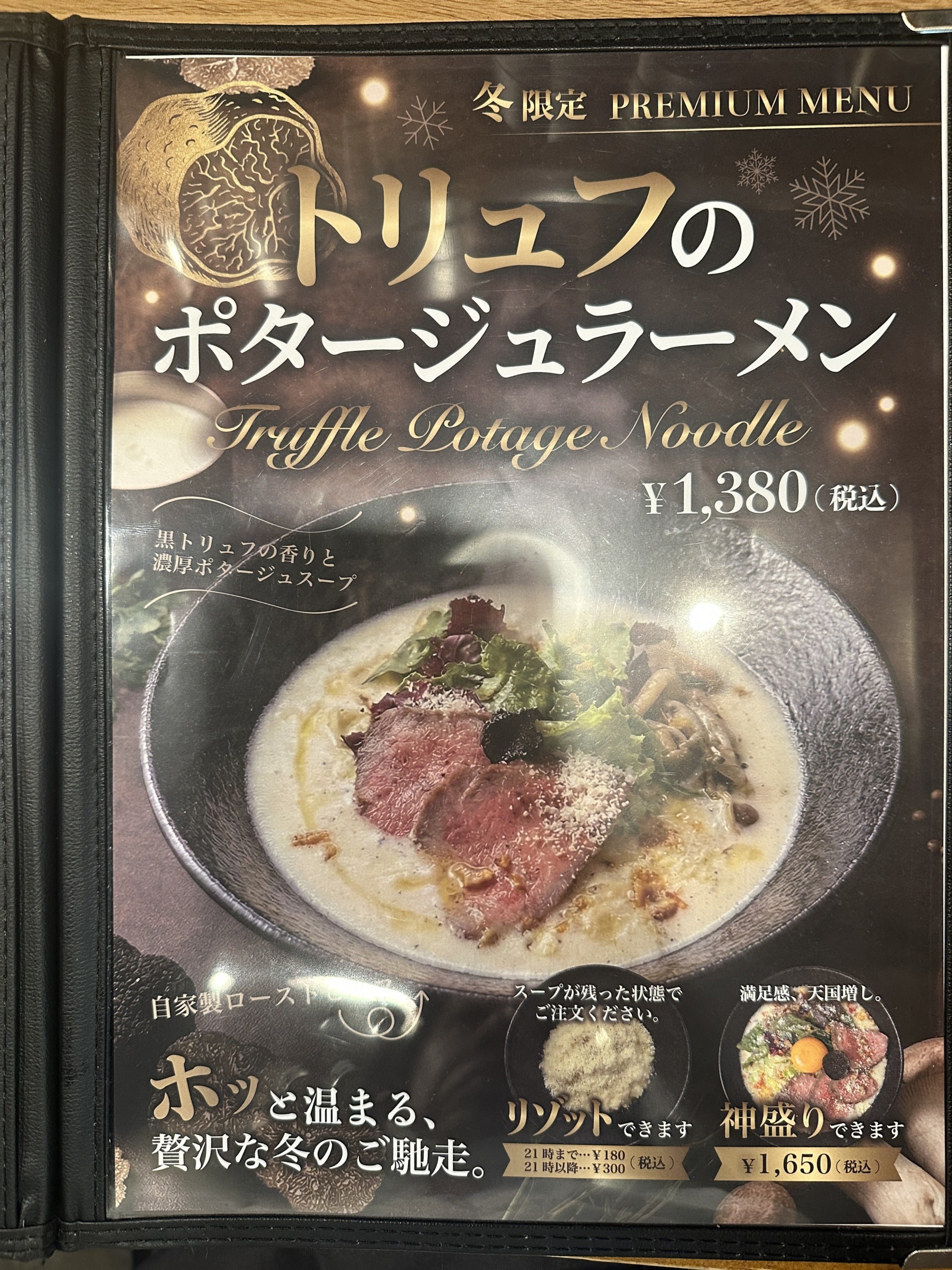 ローストビーフトッピングによりクリスマス時期にも相応しい、超絶品な限定メニュー「トリュフのポタージュラーメン 神盛り」でした。