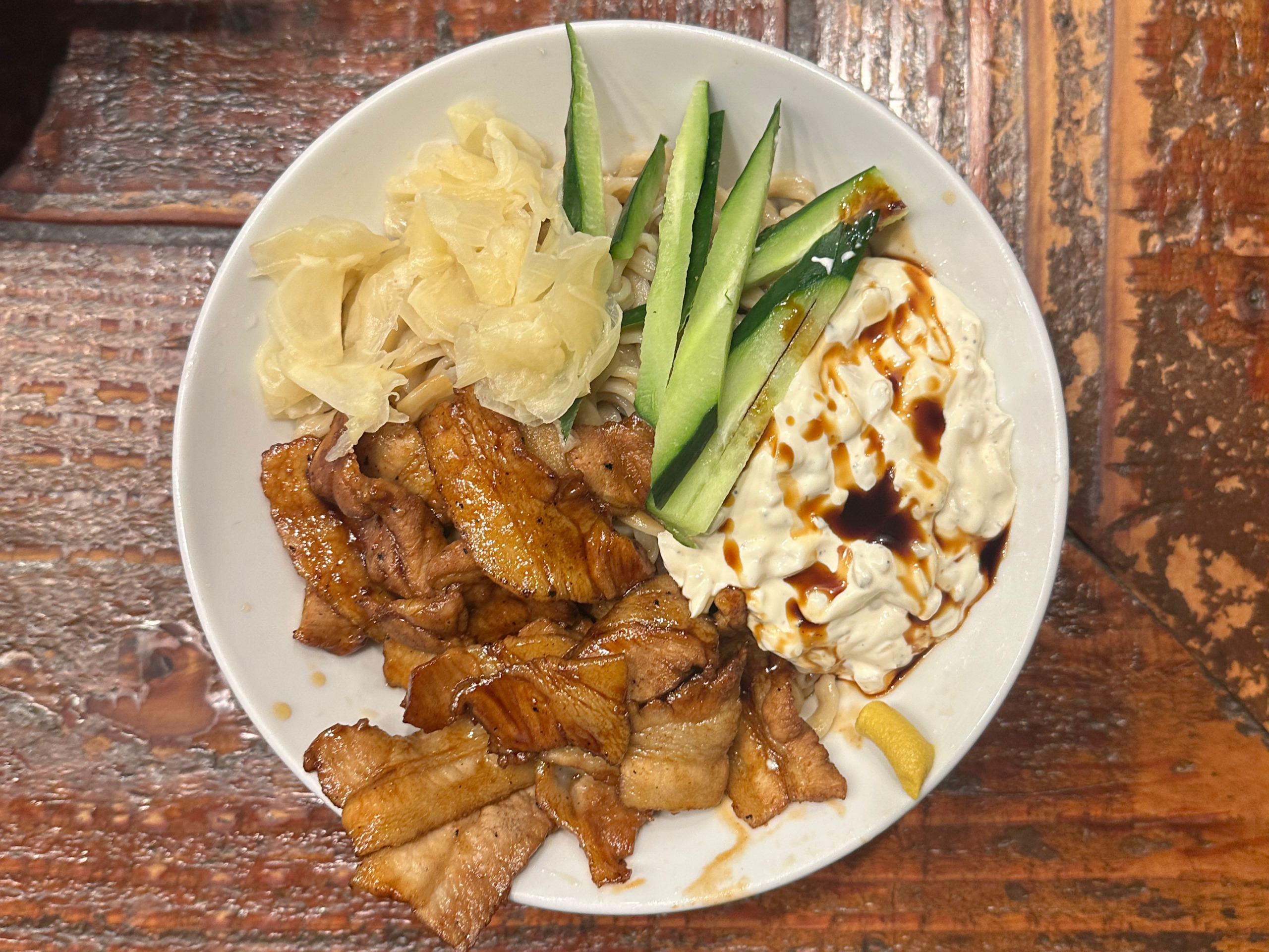 甘塩っぱ旨いタレの豚バラ肉の秀逸さ。豚バラ肉は焼き立てかほんのり温かく。 タルタルソースのインパクト。冷水で締められた極太ゴワ麺の存在感。甘酸っぱい醤油だれベースの冷やし中華。 激旨過ぎる冷やし中華でした。