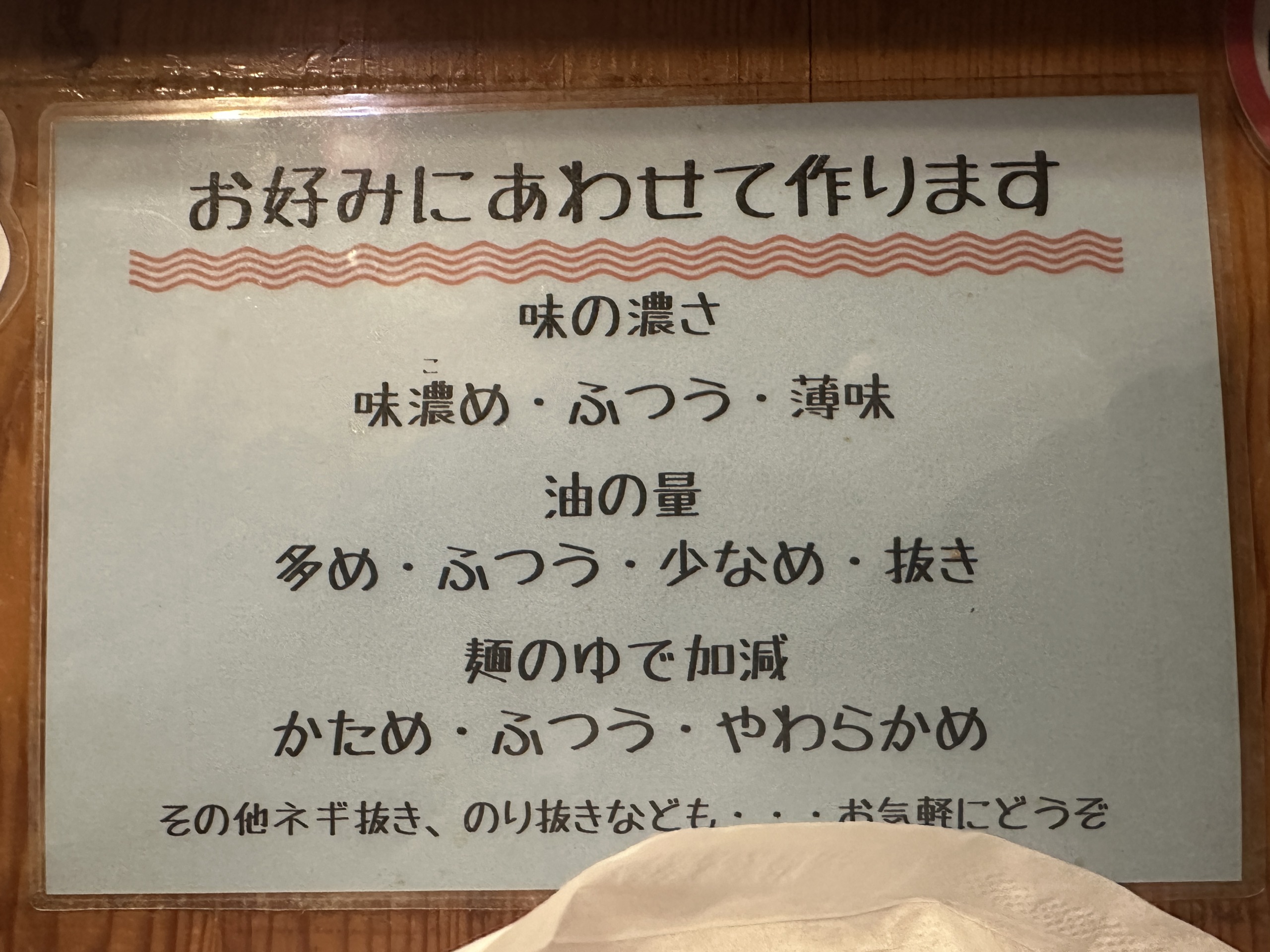 味の濃さ(味濃め・ふつう・薄味)、油の量(多め・ふつう・少なめ・抜き)、麺のゆで加減(かため・ふつう・やわらかめ)が調整可能。